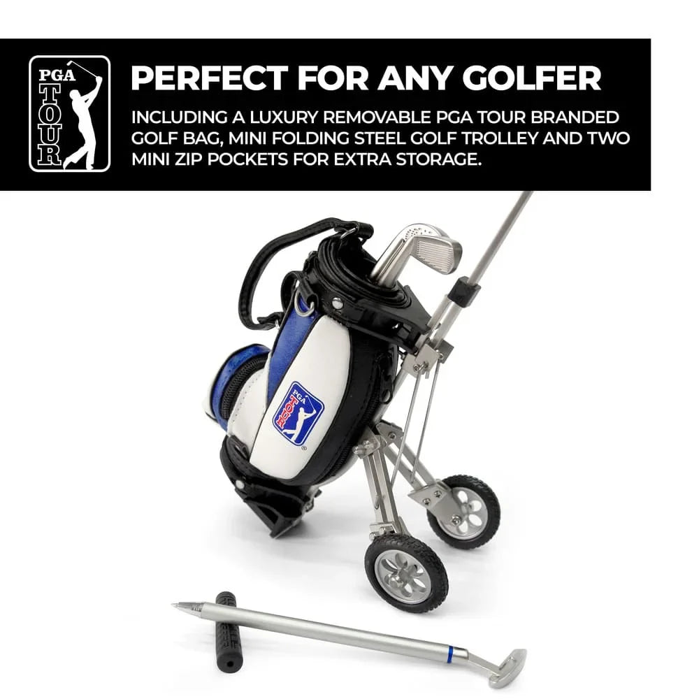 Add a touch of the fairway to your workspace with the PGA TOUR Gadget Desktop Golf Bag & Pen Set. A perfect gift for golf enthusiasts, this detailed desktop replica includes three club-shaped ballpoint pens stored in a luxury PGA TOUR mini golf bag on a fully functional miniature golf cart.